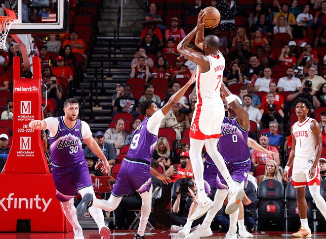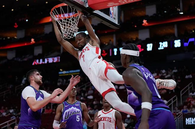 北京时间10月9日,NBA季前赛火箭主场对阵爵士,杜兰特迎来加盟火箭首秀。火箭在开局落后10分情况下,阿门、申京与杜兰特率队强势反扑,尤其是二三两节连续单节轰下40+得分逆袭。末节火箭逐步扩大两位数领先优势,最终火箭140-127逆转战胜爵士收获季前赛2连胜。